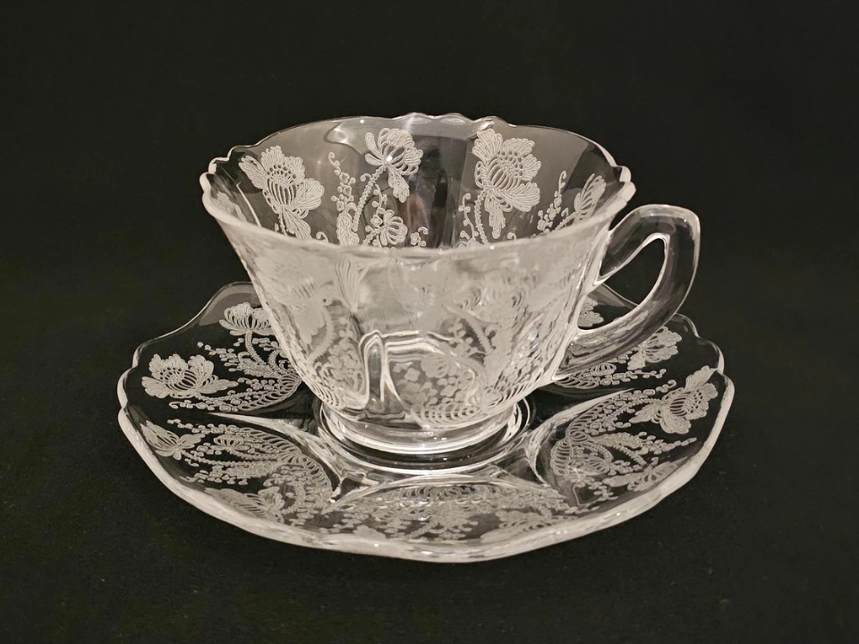 The Gloria pattern by Cambridge Glass Company, released in 1931 and produced for seven more years, features upward-reaching florals etched into scalloped-edged, sometimes gold-rimmed dishware. It was popular in its day, though rare today; the pattern is much sought after by aficionados looking to complete their collections.