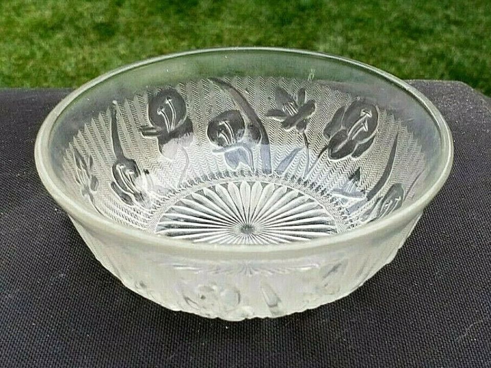 Introduced in 1931, the Mayfair pattern by Anchor Hocking is known for its elegant design featuring a floral motif and scalloped edges. Produced in colors like pink, blue, yellow, and green, this pattern became a popular choice for households during the Depression era.
