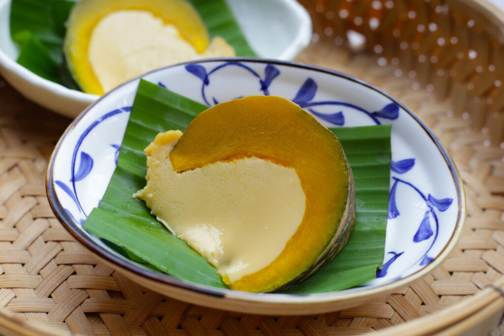 Pumpkin-coconut custard is a Southeast Asian dessert that looks as striking as it tastes. A whole pumpkin is hollowed out and filled with a rich coconut custard, then steamed until tender. Vendors slice it into wedges, revealing the smooth filling against the bright orange flesh. Sweet, creamy, and lightly spiced, it feels perfect for autumn.