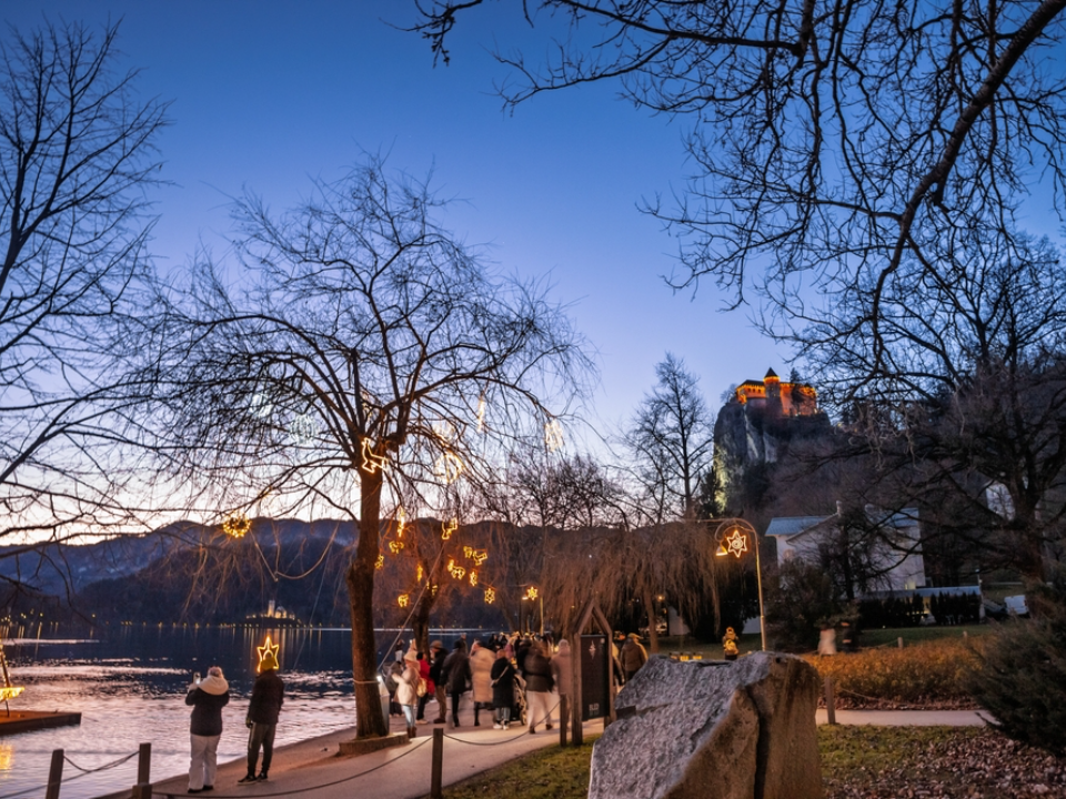 Bled offers a Christmas setting shaped by its lake and mountain views. Lights decorate paths near the water, reflecting softly on the surface. Snow on nearby peaks adds depth to the scene. The town feels calm and welcoming.