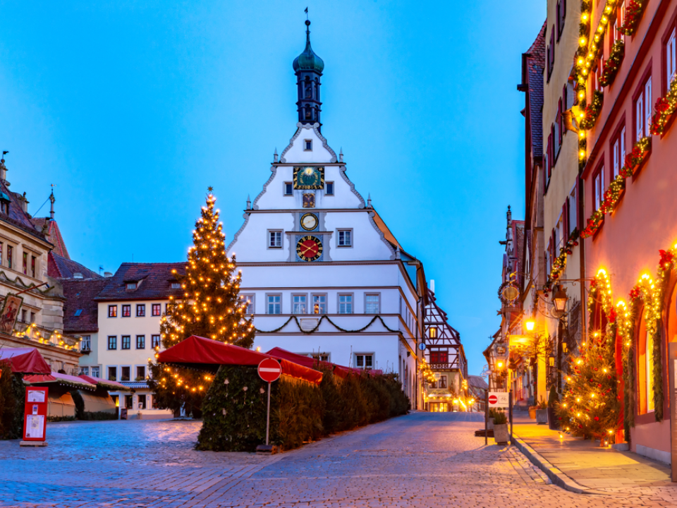 Rothenburg ob der Tauber looks like a winter postcard when Christmas arrives. The medieval walls and towers are often dusted with snow, adding to the seasonal feel. The town hosts a historic Christmas market that fills the main square with wooden stalls and festive lights.