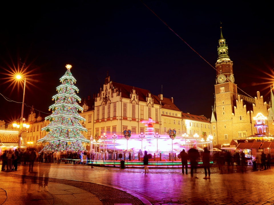 Wroclaw comes alive during Christmas around its colorful market square. Rows of historic buildings glow with lights that frame the festive scene. Wooden stalls line the plaza with decorations and seasonal treats. The atmosphere feels cheerful without feeling rushed.