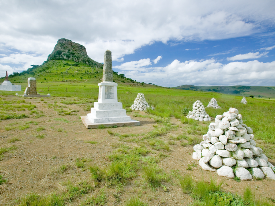 In 1879, the Battle of Isandlwana shocked the British Empire when Zulu warriors defeated a well-armed British force. The site, surrounded by rocky hills and tall grass, remains much as it was on that fateful day. Small cairns mark the graves of fallen soldiers.