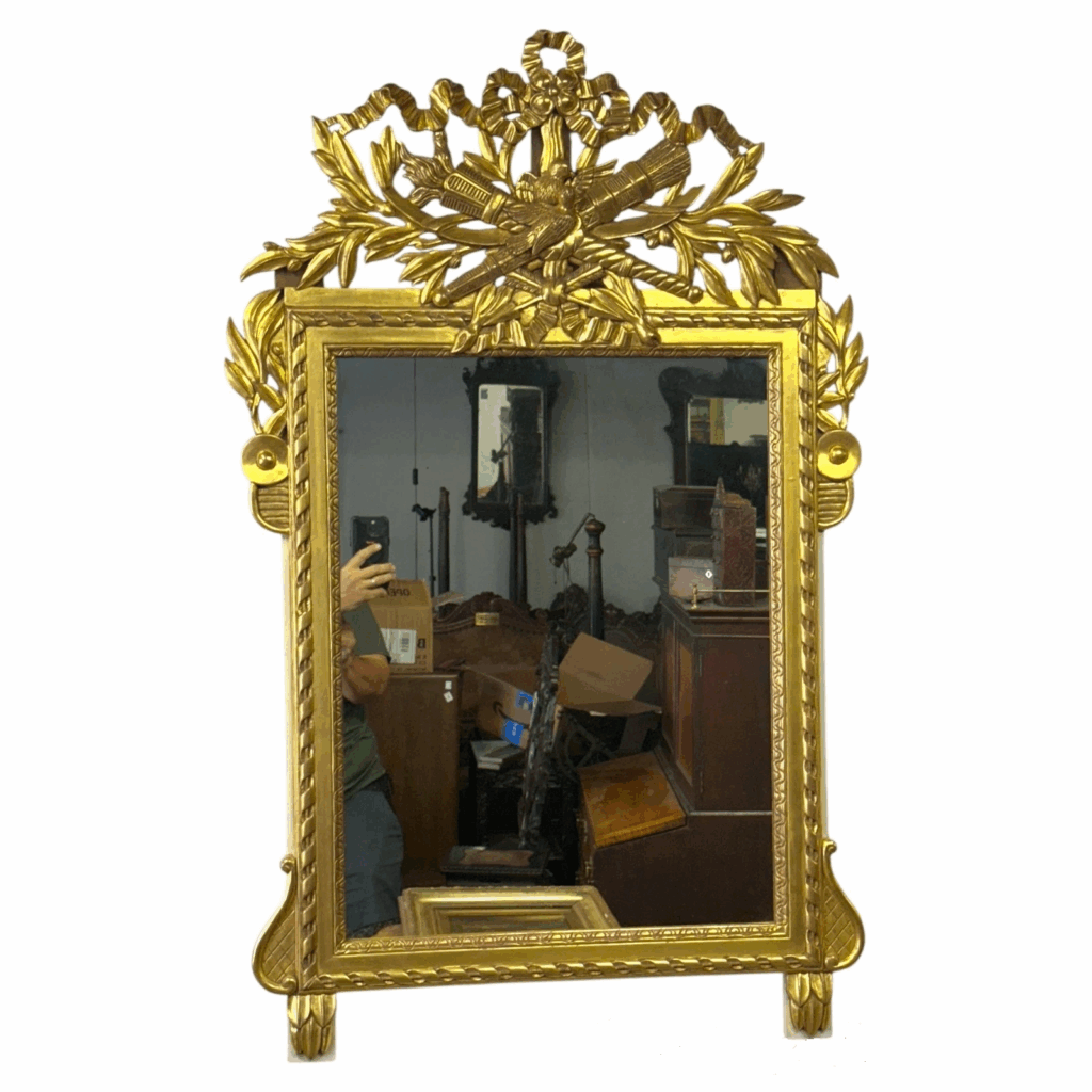 This mirror features straight lines and a more restrained design, with subtle floral and geometric motifs. The use of gilded wood as the primary material gives it a warm, radiant finish that enhances any room. These mirrors were typically designed for aristocratic French homes and reflected the shift toward more classical tastes. Despite the Revolution’s upheaval, Louis XVI mirrors have maintained their popularity with collectors. Their enduring style makes them a perfect addition to any collection focused on French antique furniture.