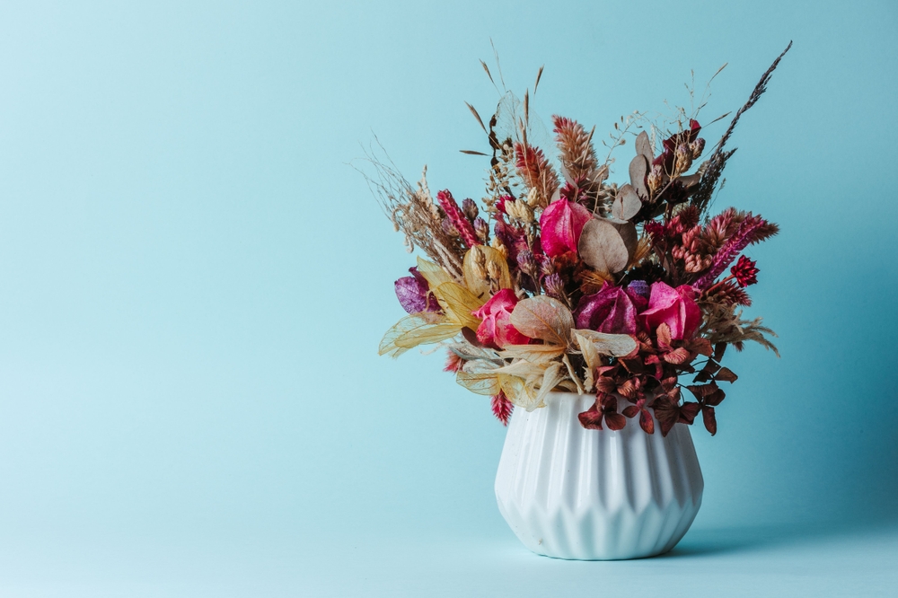A vintage vase filled with an assortment of dried flowers and herbs offers a nostalgic, elegant touch to any room. Flowers like dahlias, cosmos, and asters pair beautifully with herbs such as sage and lavender. The rich colors of the dried flowers make a striking visual contrast against the cool, neutral tones of the vase. This arrangement works especially well on a mantle or as the centerpiece of your dining table.