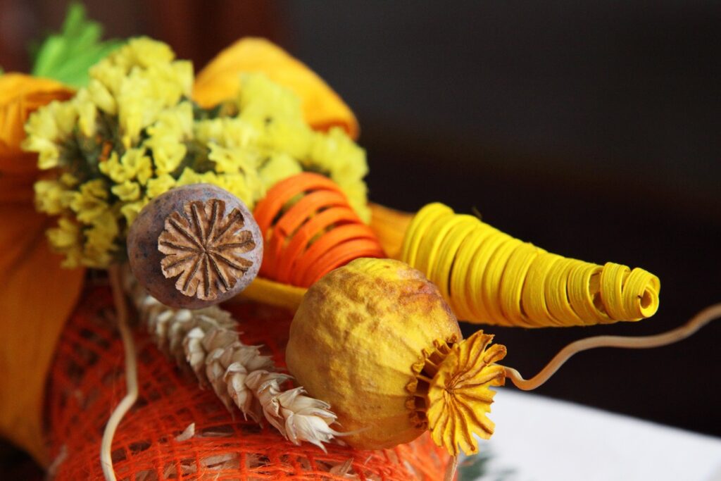 A cornucopia filled with dried flowers and herbs creates a harvest-inspired centerpiece. Use a mix of herbs like sage, thyme, and rosemary, and fill the cornucopia with dried flowers such as sunflowers, marigolds, and zinnias. This centerpiece can be placed in the center of the table to represent the abundance of the fall harvest. It brings a festive, nature-filled touch to your decor.