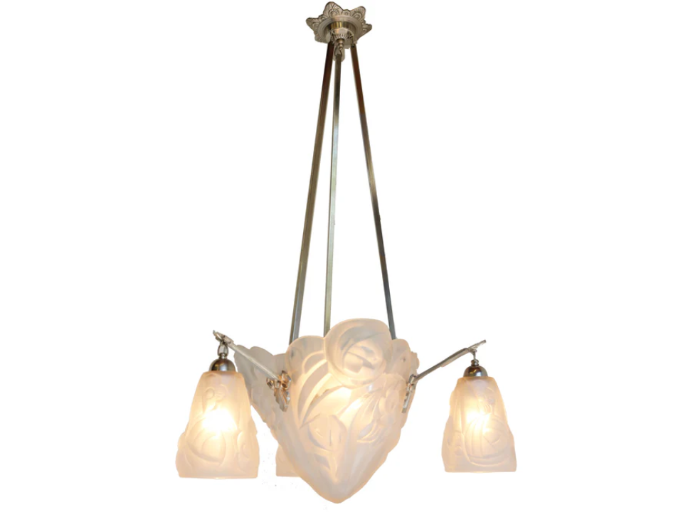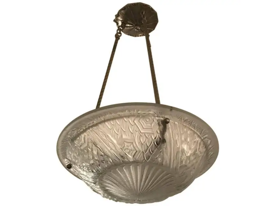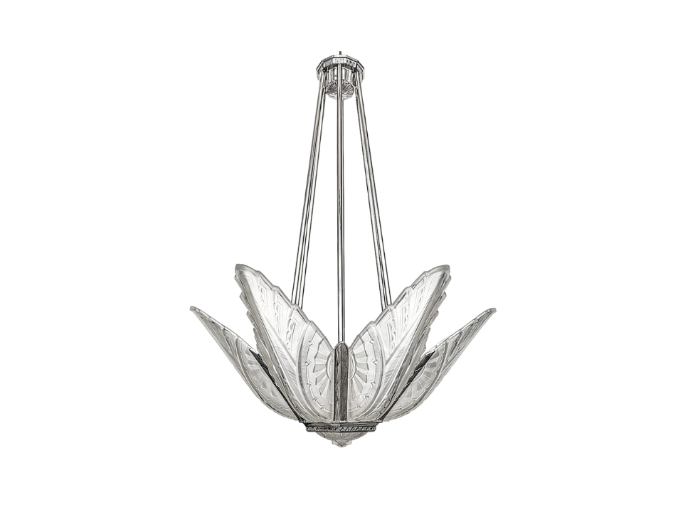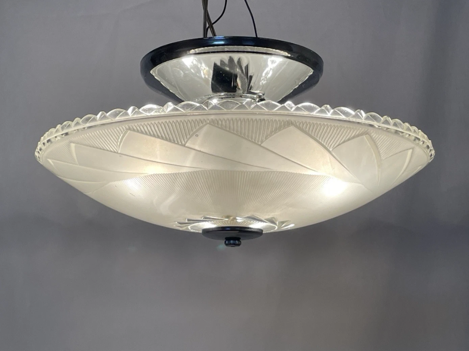 This magnificent chandelier by Georges Leleu embodies the opulence of the Art Deco movement. It features a central frosted glass bowl with intricate geometric motifs, which are surrounded by clear glass panels that diffuse light beautifully. The polished metal frame not only supports the glass elements but also enhances the piece’s elegance and grandeur.
