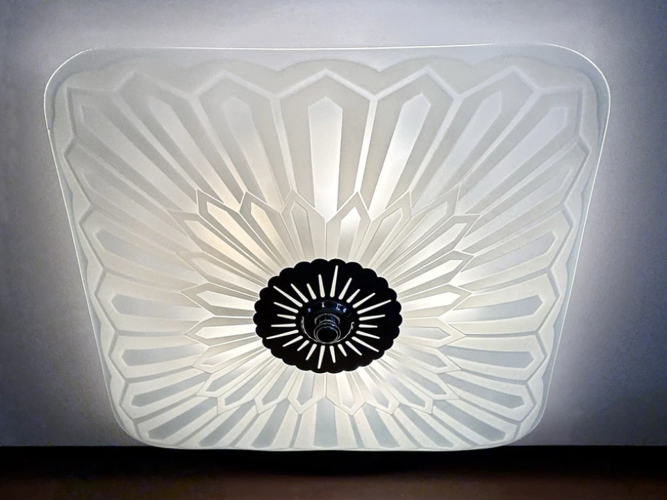 This ceiling light features an elegant combination of frosted glass and geometric patterns, typical of the Art Deco and mid-century modern (MCM) styles. Lightolier, known for its innovative designs, crafted this piece to reflect both minimalism and bold visual appeal. The geometric glass elements are carefully layered to enhance the diffusion of light, adding a touch of sophistication to any space.