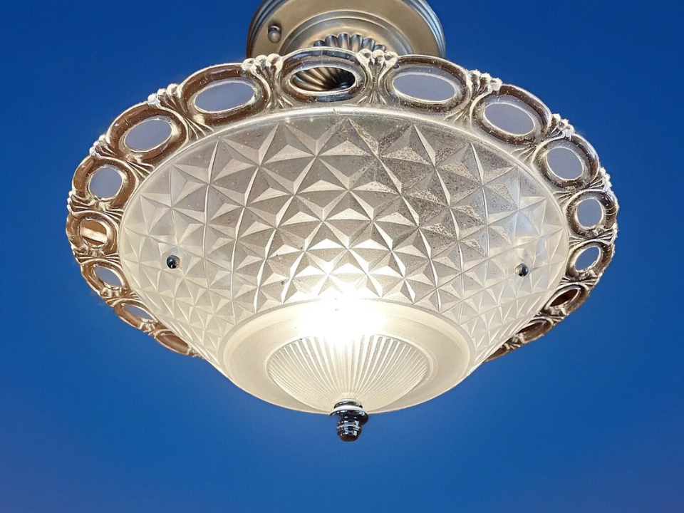 The combination of metal and glass in this ceiling light makes it a versatile piece that fits well in both vintage and modern spaces. Its refined design and historical significance elevate it to a collector’s item that adds timeless elegance to any space.