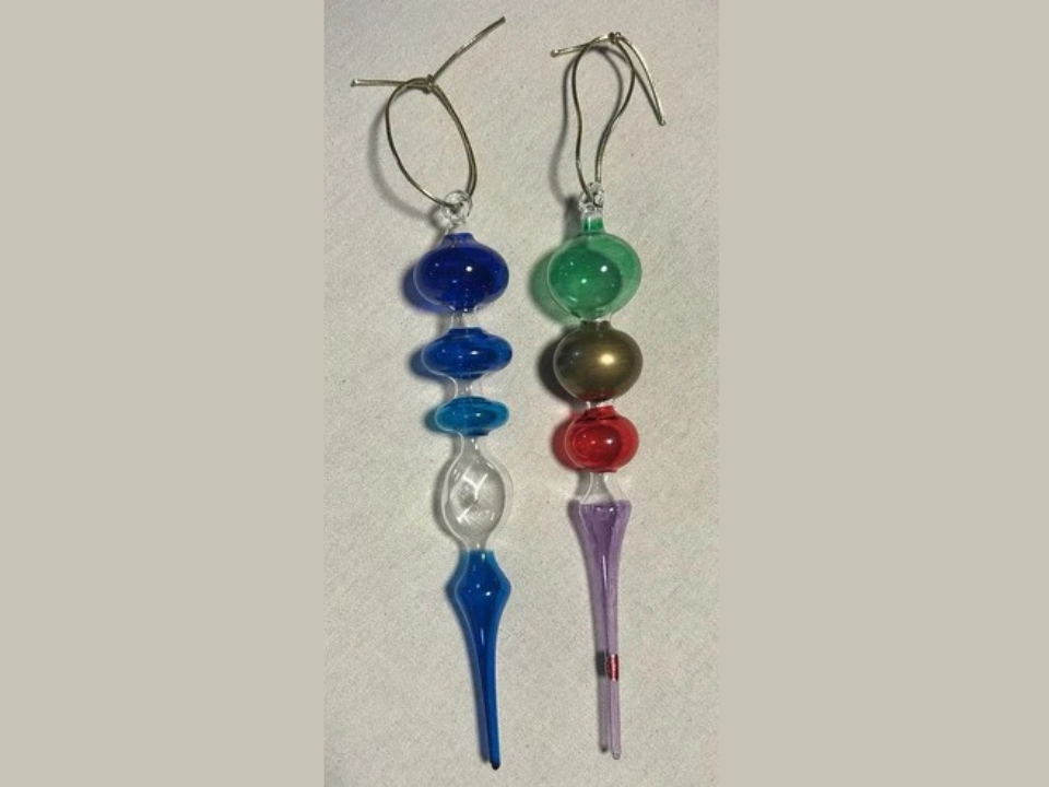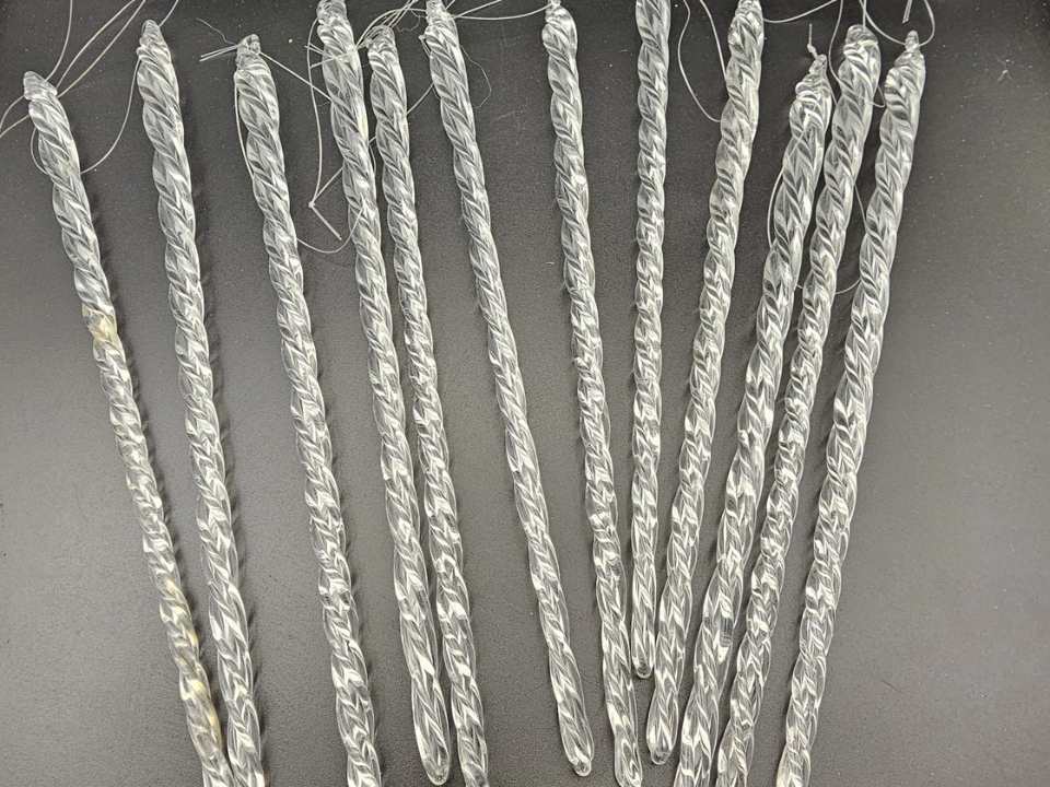 This piece resembles the spun sugar decorations once common in Eastern European holiday traditions. Glassworkers would twist thin rods of glass and pull them gently to create delicate sugar‑like icicle shapes. The glass often shows subtle spiral ridges along its length giving texture that catches light in interesting ways.