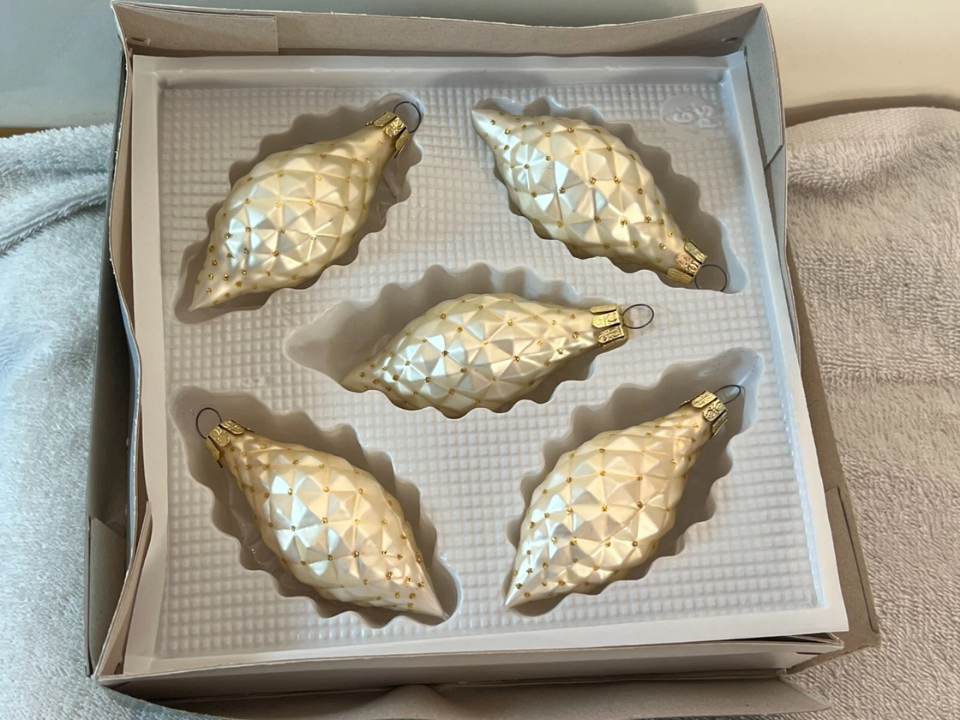 Collectors value faceted pieces because of how light behaves in them making them stand out among round or smooth ornaments. The shape remains slender and elegant which gives a refined feeling on any holiday display. High quality pieces with little wear sell for around $65.