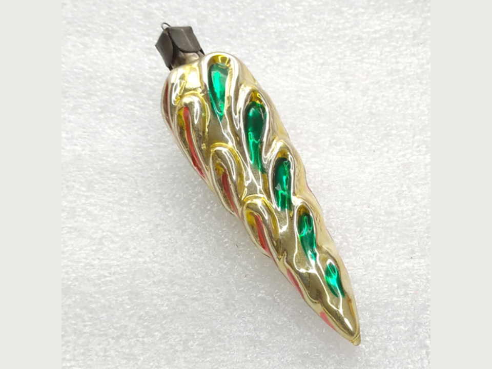 This ornament was manufactured in Czech glassworks where after blowing the glass the artisans cut fine facets along its length. The small facets catch lights and reflect them in many directions which gives a jewel‑like sparkle on a lit tree. The cut edges show excellent clarity and the glass remains free from haze which is a sign of careful preservation.