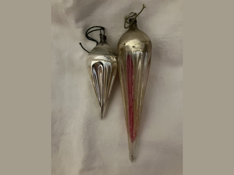 This piece originates from pre‑World War II Germany and was crafted using silvered mercury glass that gives a reflective, slightly smoky surface. The elongated icicle taper ends in a fine point that seems to catch light like real ice. Over the years patina has developed which contributes to a gentle antique sheen without overpowering the glass clarity.
