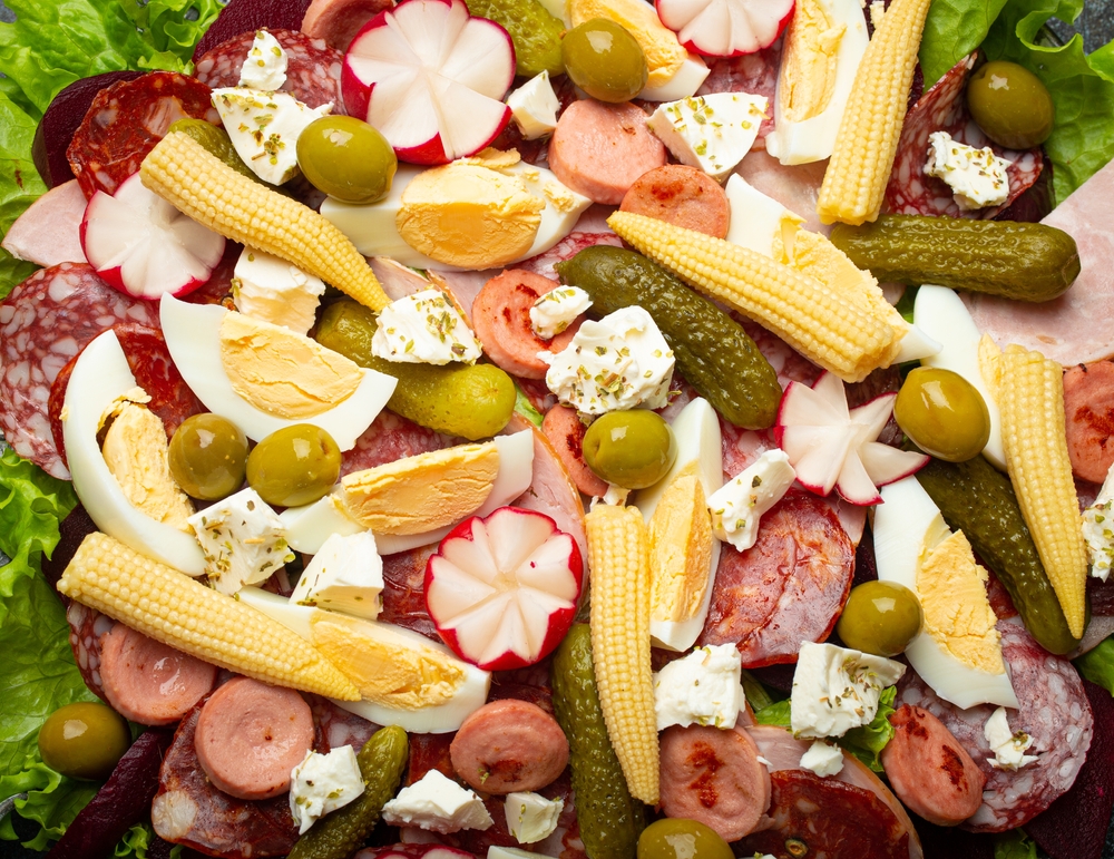 Toss a drained jar of mixed pickled vegetables with 2 cups cooked green beans, 1 cup cooked sliced beets, 1 cup cooked carrots, and 1 thinly sliced red onion. Add ribbons of deli ham and turkey, cubes of queso fresco, sliced olives, and fresh parsley and mint. Dress with a spoon of mustard stirred into a half cup of olive oil and a quarter cup of vinegar, then season with salt and pepper. Chill for a few hours and serve on crisp lettuce with hard-boiled egg wedges on top.