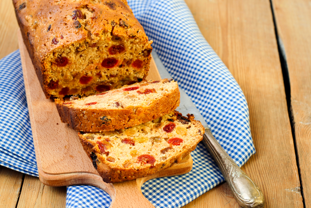 To make it, soak 1 cup mixed dried fruit and 2 tablespoons sugar in 1 cup strong black tea for two to four hours. Stir in 2 cups self-rising flour, 1 beaten egg, 1 teaspoon baking spice or cinnamon, a pinch of salt, and zest from one orange until thick and spoonable. Bake in a lined loaf tin at 175 °C for 45 to 55 minutes until a skewer comes out clean, rest ten minutes, brush with warm honey, then cool and slice. Serve warm or room temperature with butter and a little marmalade.