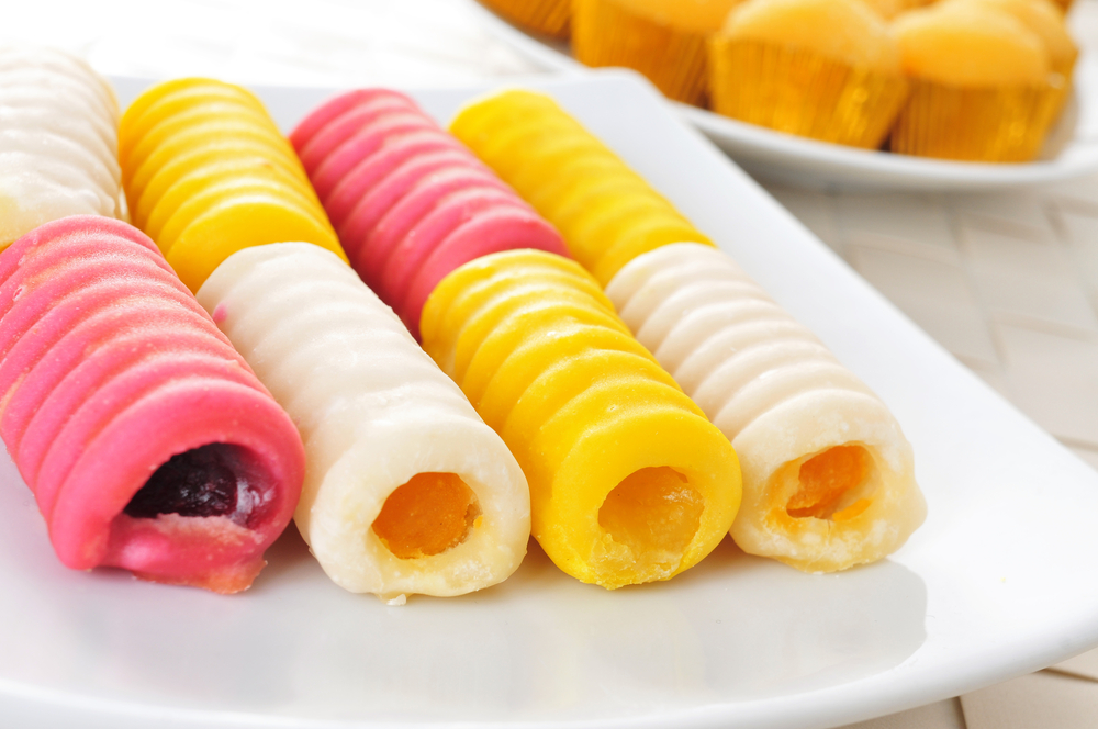 These marzipan sweets are common for All Saints Day, and they feel special for guests since each one is small and rich. A simple custard or sweetened egg yolk filling gives a creamy center inside a marzipan tube.