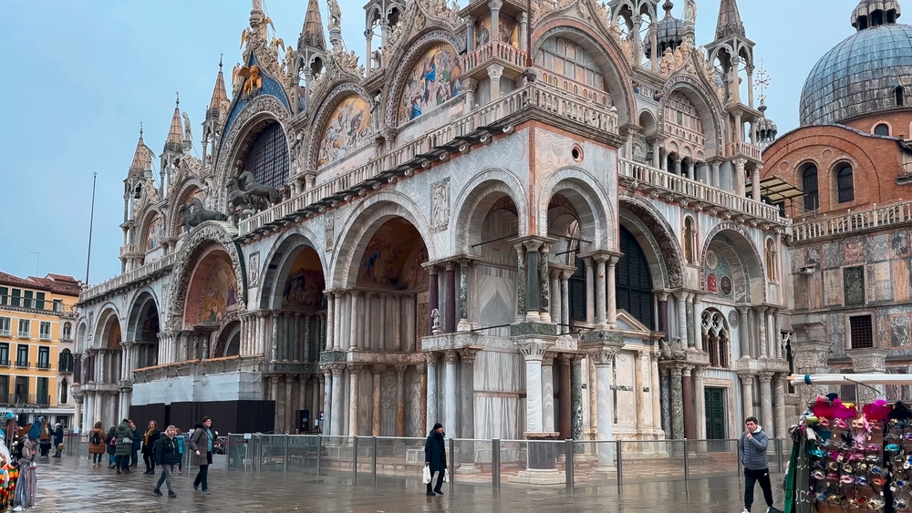 St. Mark’s Basilica, with its Byzantine architecture and stunning mosaics, is one of Venice’s most important landmarks. When the sky is overcast, the basilica’s intricate details seem to stand out even more. The golden mosaics on the domes and walls catch the soft light, creating a glow that contrasts beautifully with the darker skies outside. The building’s unique combination of Romanesque and Byzantine influences is enhanced by the dramatic weather, giving it a sense of ancient mystery.