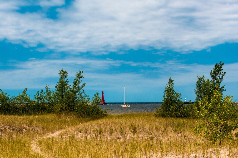 Muskegon Lake Marina is a tranquil spot located along the shores of Lake Michigan, offering stunning views and easy access to the water. The marina is located near the Muskegon South Pierhead Lighthouse, which stands proudly at the entrance to the harbor. The lighthouse walk provides scenic views of both the marina and the lake, and benches along the pier offer a quiet place to relax. Muskegon Lake itself is a favorite for boating, fishing, and nature watching, making this a perfect spot for outdoor enthusiasts.