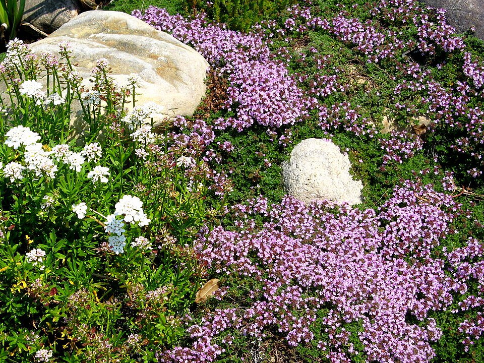 Creeping thyme is a low-growing herb that forms a dense, fragrant mat, making it an excellent choice for ground cover. It thrives in full sun and well-drained soil, and it can tolerate cooler temperatures, often beginning to spread early in the spring. This hardy plant works well between steppingstones or in rock gardens due to its ability to tolerate foot traffic.