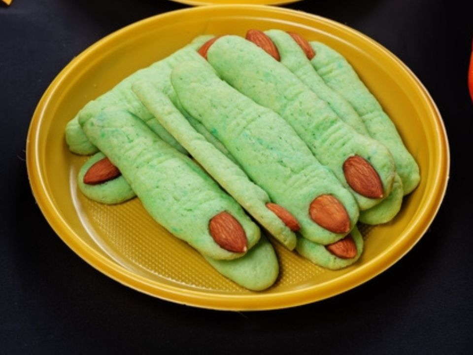 Recipe: Roll out pizza dough and cut it into thin strips. Shape each strip into finger-like shapes, adding an almond at the end to look like a fingernail. Bake at 375°F for 10-12 minutes until golden. For the garlic butter, melt butter and add minced garlic, then brush over the breadsticks. Serve with a glass of chilled Chardonnay to balance the richness.