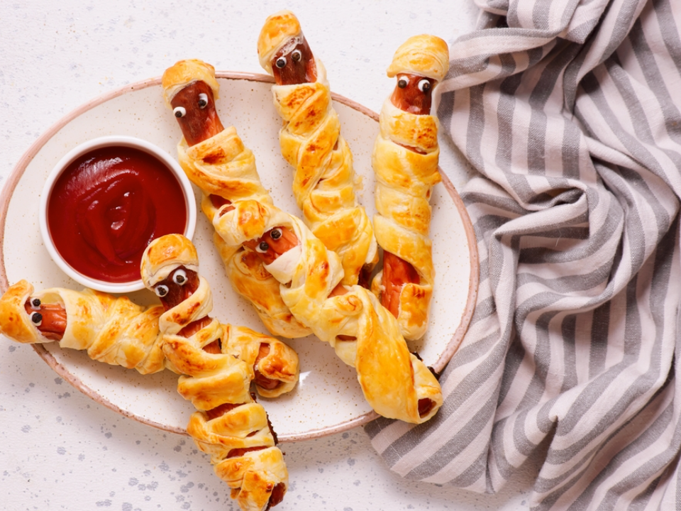 Mummy hot dogs are a fun, spooky twist on the classic. They are made by wrapping hot dogs in strips of crescent dough, leaving gaps for the “mummy’s eyes.” Once baked, small dots of mustard or ketchup make the perfect eyes. These creepy-cute snacks are a hit for any Halloween movie night. Pair them with a Bloody Mary for a savory and spicy drink that complements the richness of the hot dogs.