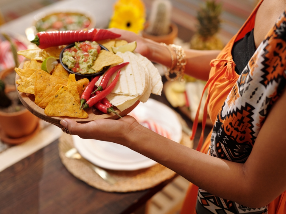Recipe: Layer refried beans, seasoned ground beef, guacamole, sour cream, salsa, shredded cheese, and black olives in a dish. Serve with tortilla chips. For the margarita, combine 2 ounces of tequila, 1 ounce lime juice, and ½ ounce triple sec. Serve over ice with a salted rim.