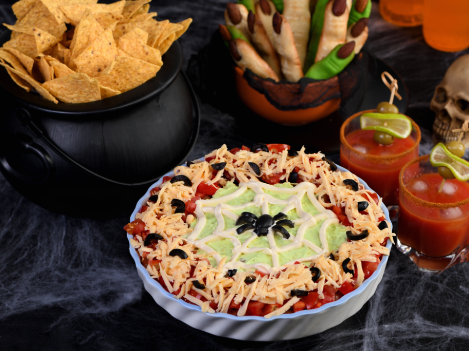Spooky Halloween Seven Layer Taco Dip with Tortilla Chips and Margarita