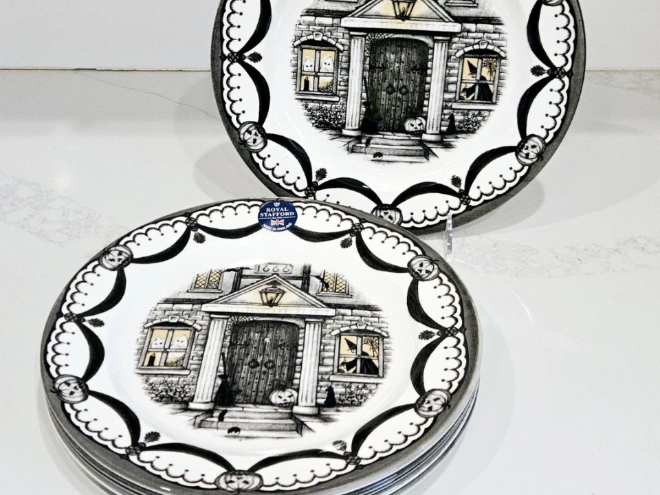 For those who want their Halloween dining experience to be as spooky as their décor, the Gothic Haunted House set is perfect. Featuring detailed illustrations of spooky mansions, graveyards, and ghosts, this set creates an eerie atmosphere that enhances any Halloween gathering. The set includes dinner plates, salad plates, and matching cups, all with dark tones and creepy imagery.