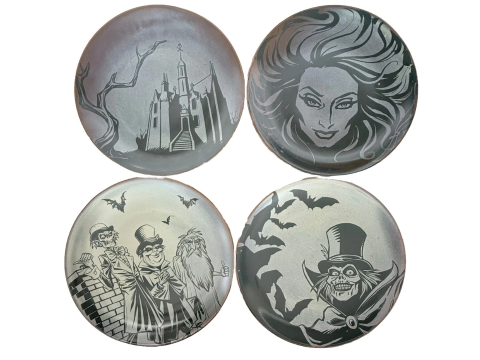 For those seeking an elegant yet spooky vibe, the Haunted Mansion black and gold dishware set is a must-have. With a dark, glossy black finish and gold accents, the set includes dinner plates, bowls, and teacups. The design features subtle haunted house motifs, including cobwebs, skulls, and ghostly figures that add a sophisticated Halloween touch.
