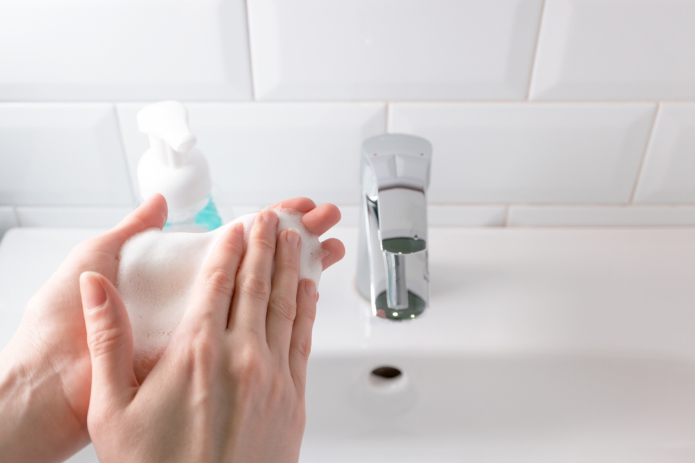 If possible, switch to a soap with added ingredients like aloe vera or honey, which help soothe and hydrate the skin. You may also want to use a foaming hand wash, as it’s often gentler on the skin than traditional soap. Keep a moisturizing hand soap in your bathroom to help your skin stay soft with every wash.