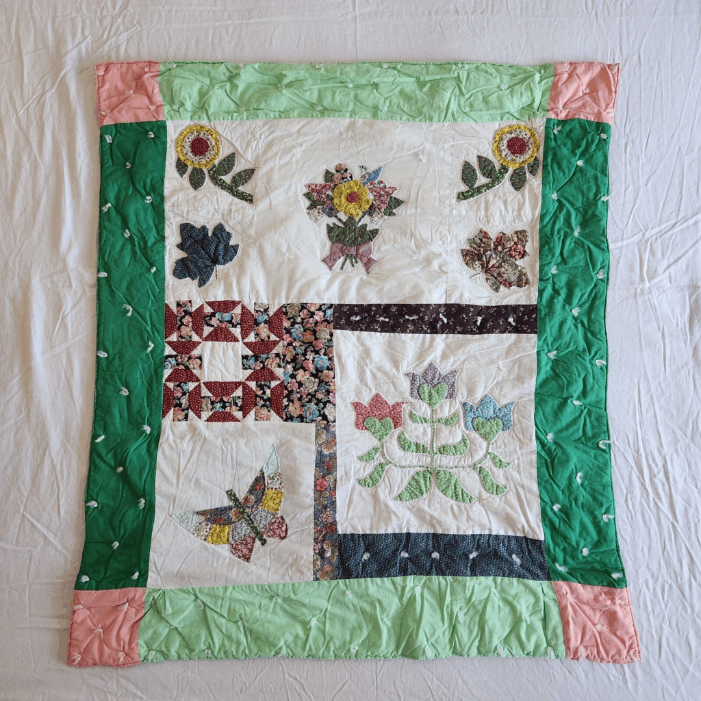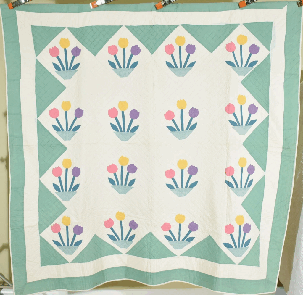 The Tulip Basket design reflects the optimism of the era, particularly during the Great Depression when many families used scraps of fabric to create something beautiful. These quilts are often made using a mix of cotton fabrics, including floral prints and solid colors, adding texture and variety to the overall design. Due to the hand-pieced elements and hand quilting, these quilts stand as beautiful examples of domestic art from the mid-20th century. Their charm, combined with their historical significance, ensures they continue to capture the attention of collectors today.