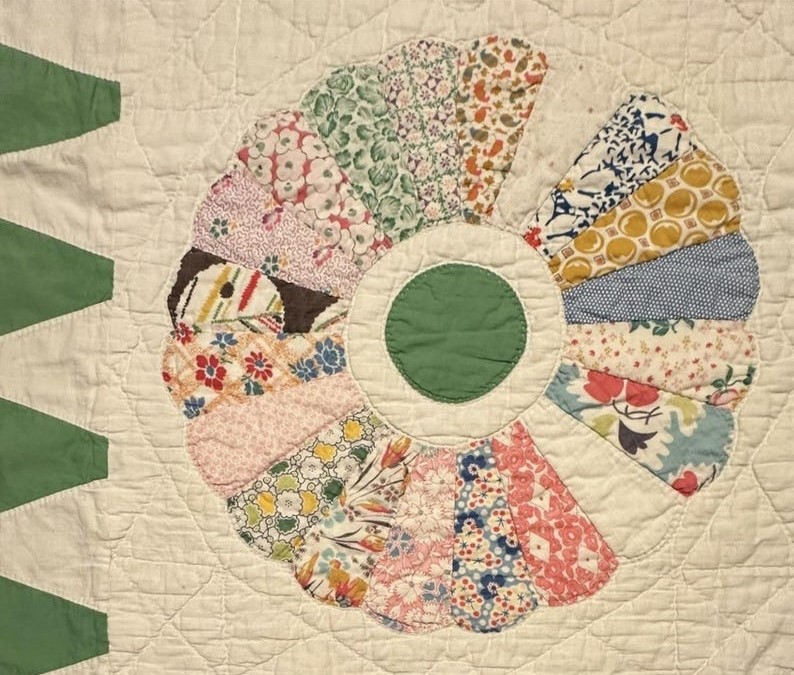 Quilts using the Dresden Plate pattern were popular in the 1920s and 1930s. The design, which features circular sections resembling flower petals, often requires intricate piecing, which makes these quilts more valuable. When in good condition, these quilts can fetch prices around $150 to $250, with some rare examples reaching higher amounts. The skill required to create this pattern, along with the age of the quilt, adds to its desirability. The Dresden Plate remains a favorite among collectors for its timeless charm and delicate craftsmanship.