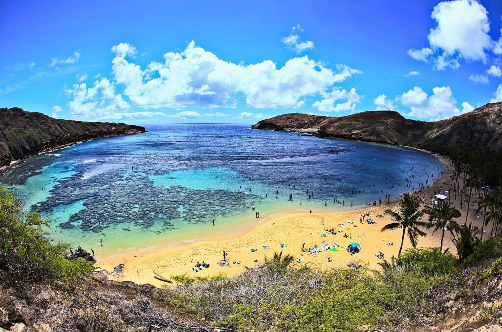 Hanauma Bay gives snorkelers clear views of coral and colorful fish in gentle conditions. The curved bay shelters the water, making it easy for beginners to feel steady. People spread out across the sand before wading in with masks and fins. Morning light helps brighten the underwater shapes.
