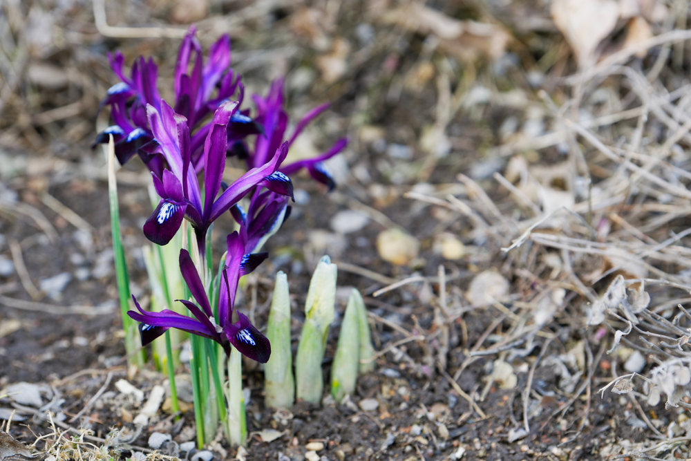 Iris reticulata, also known as Dwarf Iris, is a small but stunning flower that blooms in early spring, often starting in late winter. Its rich blue, purple, or white flowers are a cheerful sight as they push up through the cold soil. Dwarf Iris thrives in full sun and well-drained, sandy soil, making it ideal for rock gardens or along the edges of garden paths.
