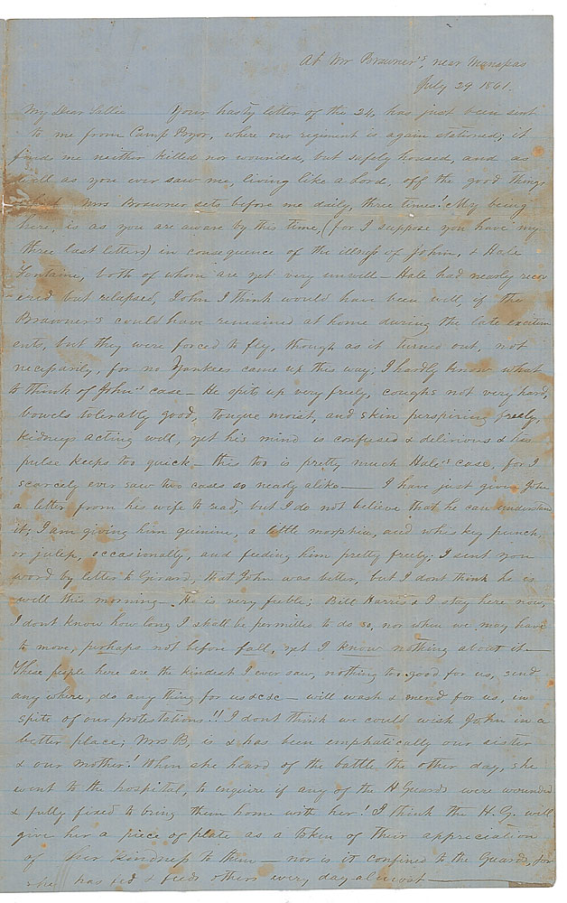 This four page letter was penned just after First Bull Run by a Home Guard member in Henry County Virginia. It describes care for a wounded man and mentions medicines like quinine and whisky punch. The medical detail gives vivid insight into early war realities. RR Auction cataloged the piece and its timing is compelling. A current estimate sits around four hundred to eight hundred dollars based on similar early war Confederate letters.