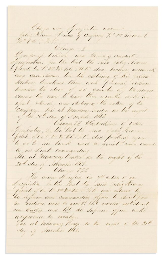 This lot included letters and documents tied to Maryland units and themes. Swann Galleries recorded provenance to collector Arthur G. Gil Barrett. Regional focus attracts buyers with family ties or local history interests. Mixed document sets offer maps, orders, and personal notes in one purchase. A reasonable estimate would be one thousand to three thousand dollars depending on content depth.