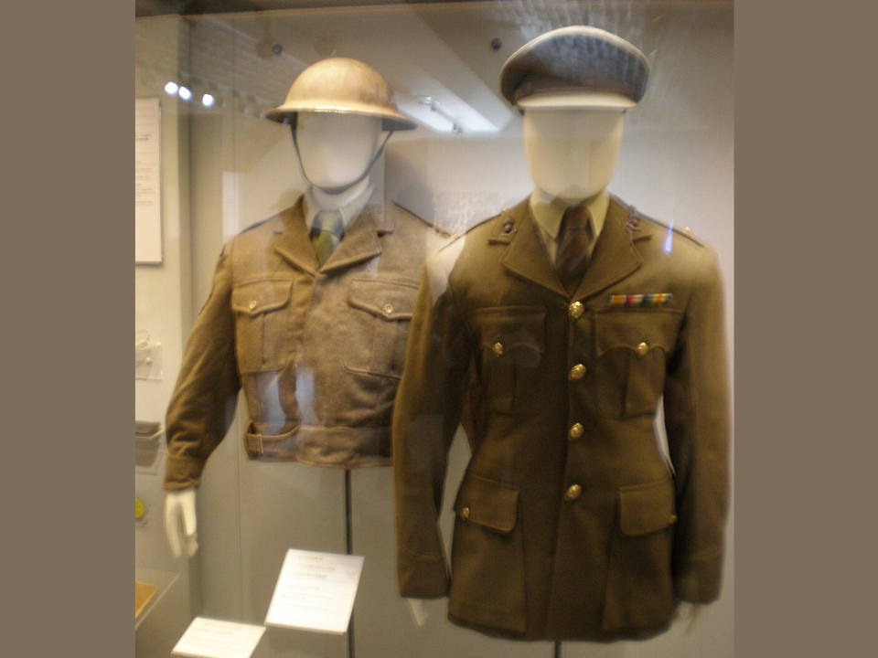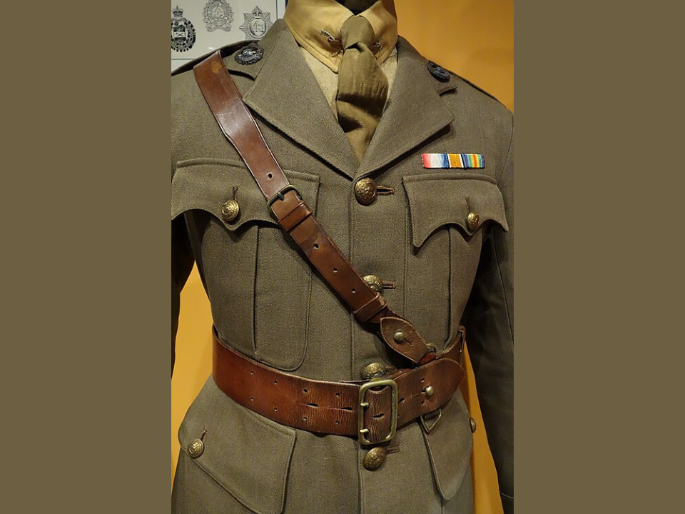 This uniform represents the British Army’s transition to khaki service dress during World War I. The jacket and trousers are made from a durable wool blend in khaki, designed for practicality rather than the brightly coloured uniforms used previously. The museum display often includes details about how these uniforms were intended to be both functional and inconspicuous, offering protection against the harsh conditions of trench warfare. Along with the uniform, visitors can view the insignia, which helped identify rank and regiment, reflecting the structure of the British Army at the time.