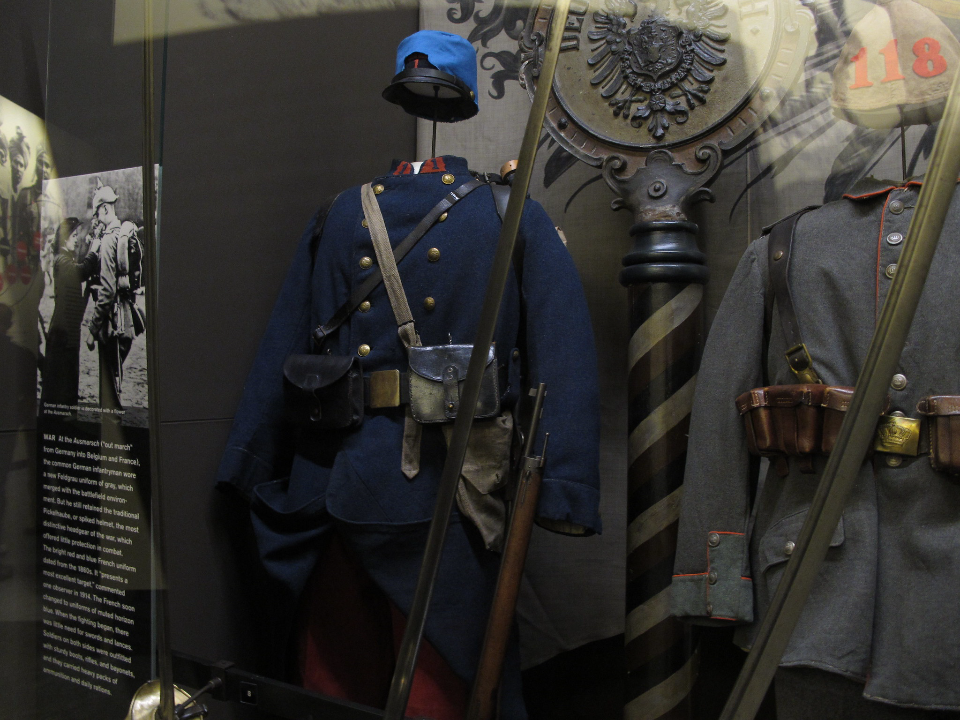 The French Army’s distinctive “horizon blue” uniform was introduced during World War I to provide soldiers with a less visible appearance on the battlefield. The color, which had a slight bluish tint, was designed to blend with the French sky, making soldiers harder to spot by enemy forces. Museum displays of this uniform often pair it with explanations of the challenges the French military faced, including the need for innovation in both technology and uniforms. The tunic and trousers are well-preserved, showcasing the lightweight, practical nature required for warfare in the trenches.