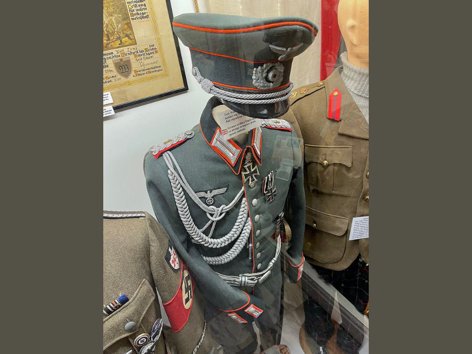 This uniform represents a high-ranking officer in the German Panzer division during World War II. The tunic features distinctive collar tabs and shoulder epaulettes that denote the officer’s rank and status within the armoured forces. In museum displays, this uniform is often paired with historical photographs or video footage of tank battles, showcasing the strategic importance of the German tank divisions.