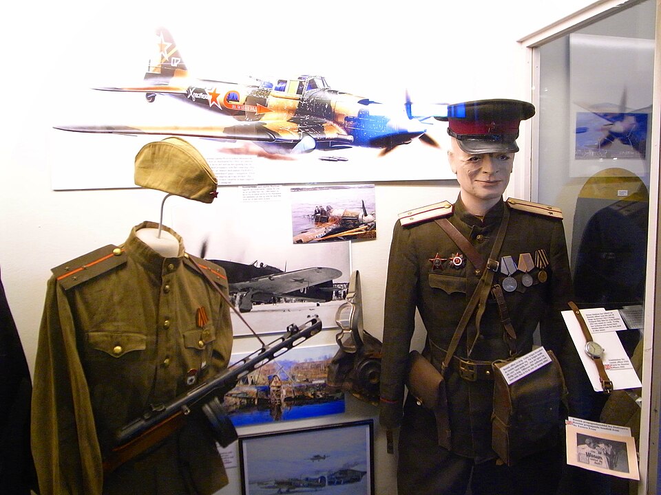 This Soviet Red Army parade tunic is from the tail end of World War II, worn by officers during victory celebrations. The jacket is adorned with gold braid, large shoulder epaulets, and several medal ribbons that signify the soldier’s service during the conflict. The museum typically presents it to highlight the Soviet Union’s military prowess and the importance of parades and formal events after the war.