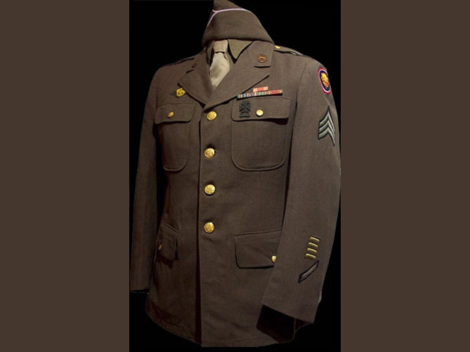 This U.S. Army uniform dates back to the pre‑World War II era, showcasing the military’s preparation for the impending conflict. The Army Service Uniform is made from wool and features a dark blue tunic with shoulder epaulettes and a distinctive yellow piping along the seams. The uniform reflects the style worn by officers and non-commissioned officers during the 1930s and 1940s, before the uniform became more standardized during the war. In a museum display, this uniform is often positioned alongside other early wartime artifacts, helping to tell the story of