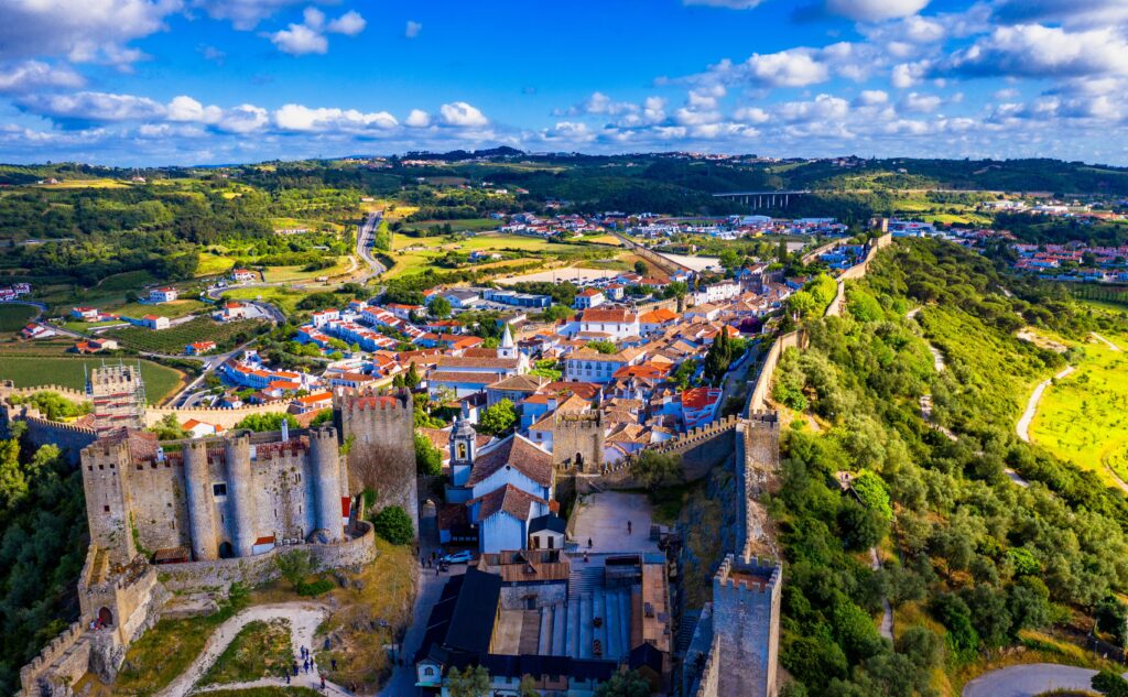 Óbidos is a walled medieval town that feels preserved from another age. Whitewashed houses with blue and yellow trim line narrow lanes, while red tile roofs glow under the autumn sun. Surrounding vineyards add another layer of seasonal color as the grape harvest finishes.