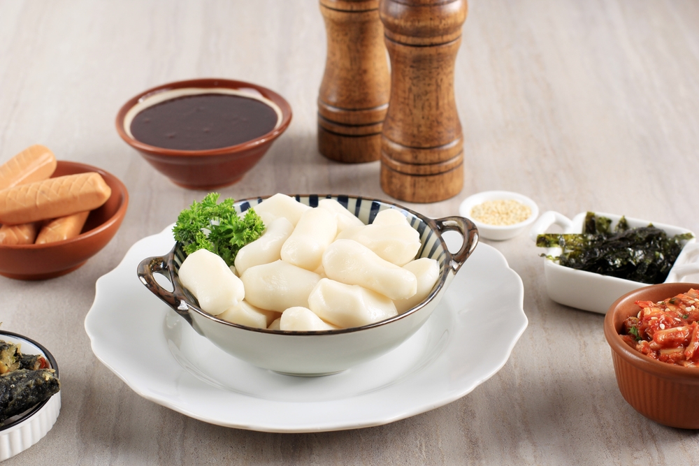 To make tteok, mix rice flour with warm water and knead until smooth. Shape into small discs and fill with sweet red bean paste. Steam for 15 minutes, then brush lightly with sesame oil to keep them soft. These colorful rice cakes are often arranged beautifully on plates for family celebrations.