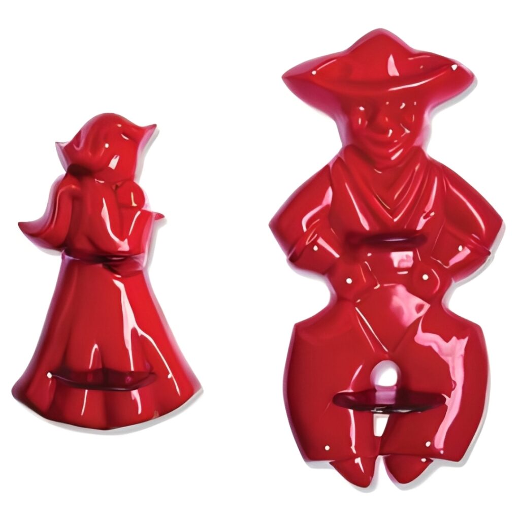 These handle-style cutters from the 1950s include bells, gingerbread figures, stars, and trees. Their small raised handles made them easier to grip, which gave them a unique place in mid-century kitchenware. Collectors enjoy these because they represent a transitional design in cookie-cutter history. A typical lot sells for US $22 to US $28. Sets with sturdy handles attract the most attention.