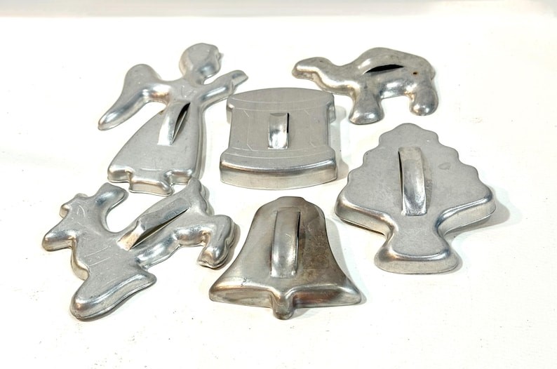 This Wear-Ever assortment dates back to the 1950s and includes seasonal shapes made from lightweight aluminum. Many collectors enjoy Wear-Ever products because they represent a strong era of American kitchenware. Sets often include bells, trees, stars, and gingerbread figures. Values commonly fall between US $20 and US $30. Lots containing multiple shapes tend to have higher appeal.