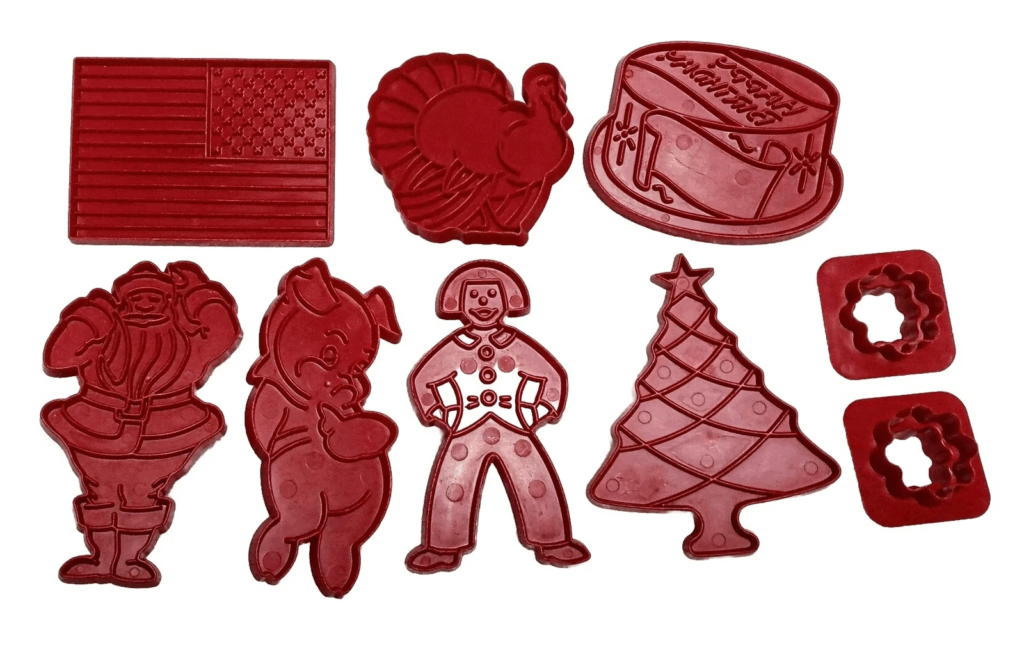 The Merry Xmas set first appeared in the late 1940s under the well-known Aunt Chick’s brand. Many collectors look for this set because of its bright red plastic and charming vintage shapes. The set usually includes designs such as Santa, a tree, a star, and a stocking. Values tend to sit around US $20 to US $30 depending on condition. Sets with recipe inserts often sell on the higher end.