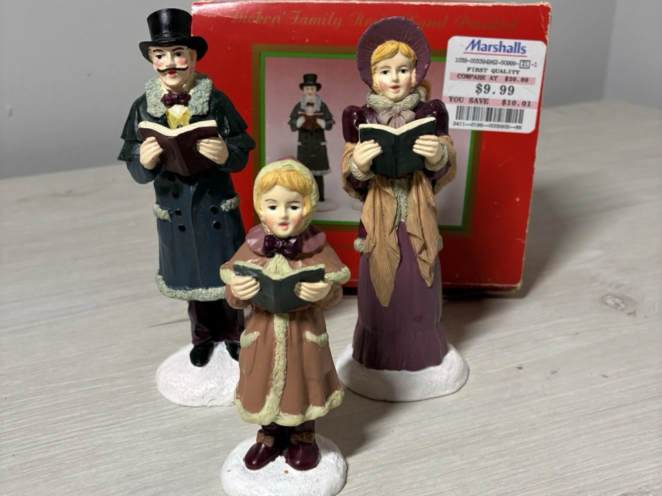 The tallest figure stands about nine inches high the entire set spans roughly twelve inches in width. Placing this set near a fireplace or under soft lighting creates a nostalgic holiday scene. Estimated value for the set is about $46.