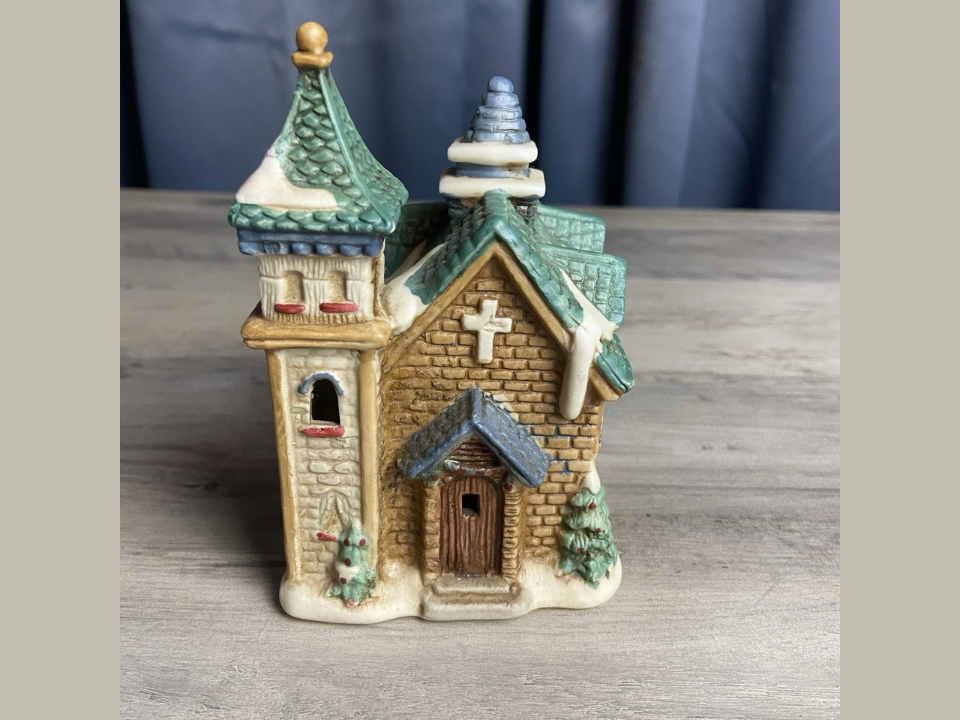 It is about nine inches tall and seven inches wide giving a solid footprint when placed on a mantle or sideboard. People often surround this church with other miniature houses to build a small holiday village ensemble. Its quiet charm makes it a meaningful anchor for village scenes. Estimated market value is about $38.