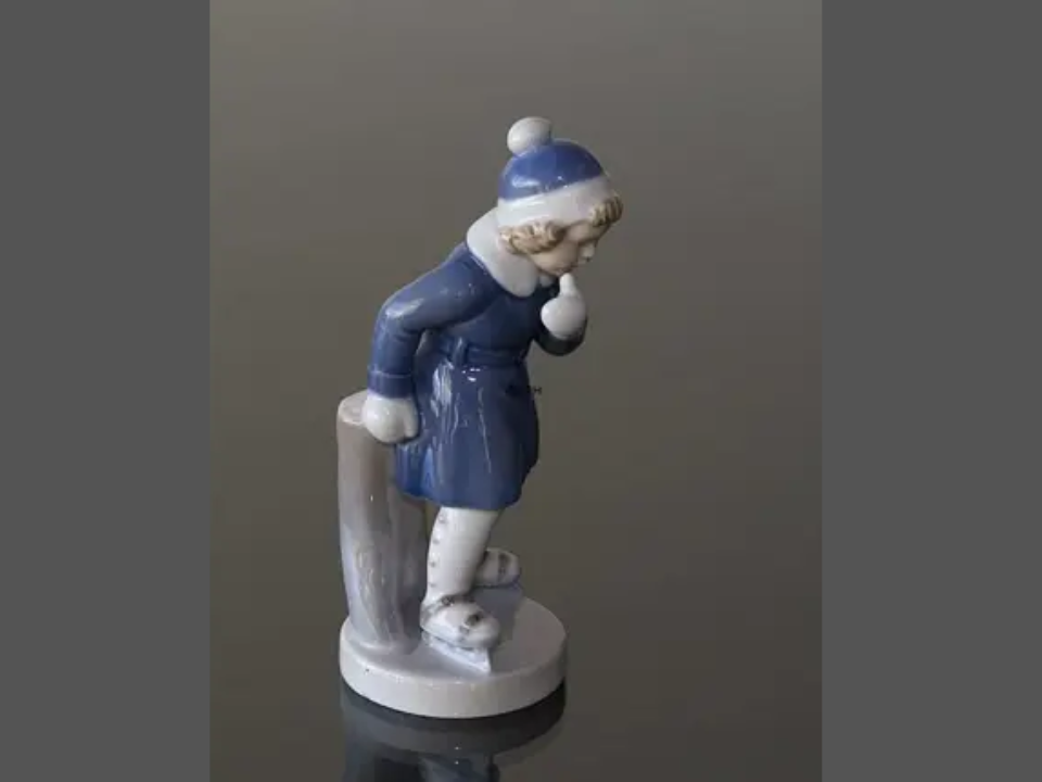 This graceful figure shows a young girl mid glide wearing a pale blue coat and matching hat. Her arms extend gently as if balancing on ice providing a sense of movement and elegance. The base resembles a frozen pond with translucent blue glaze that catches light softly. Snowy details along the hem of her coat and around her skates evoke a crisp winter evening on an outdoor rink.