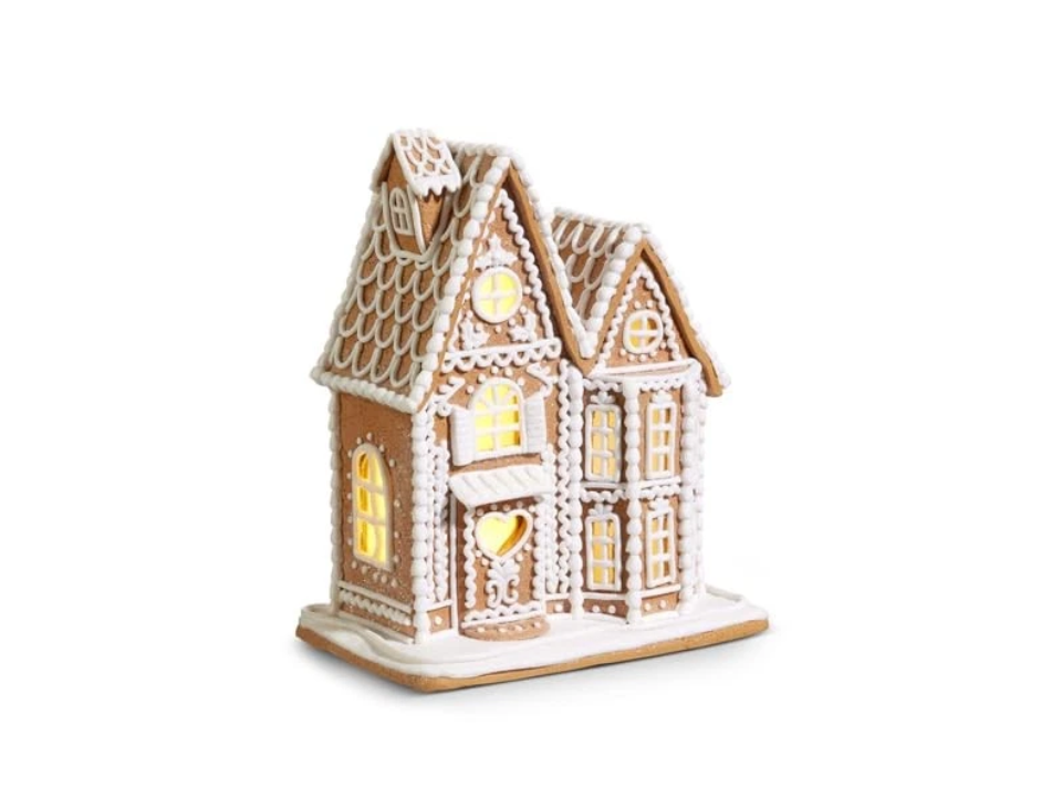 This porcelain figurine depicts a cozy gingerbread cottage with frosted roof and candy cane trim. Tiny LED lights inside cast a soft warm glow through the windows creating a welcoming holiday scene. Snowy accents around the base mimic freshly fallen snow around a winter home.